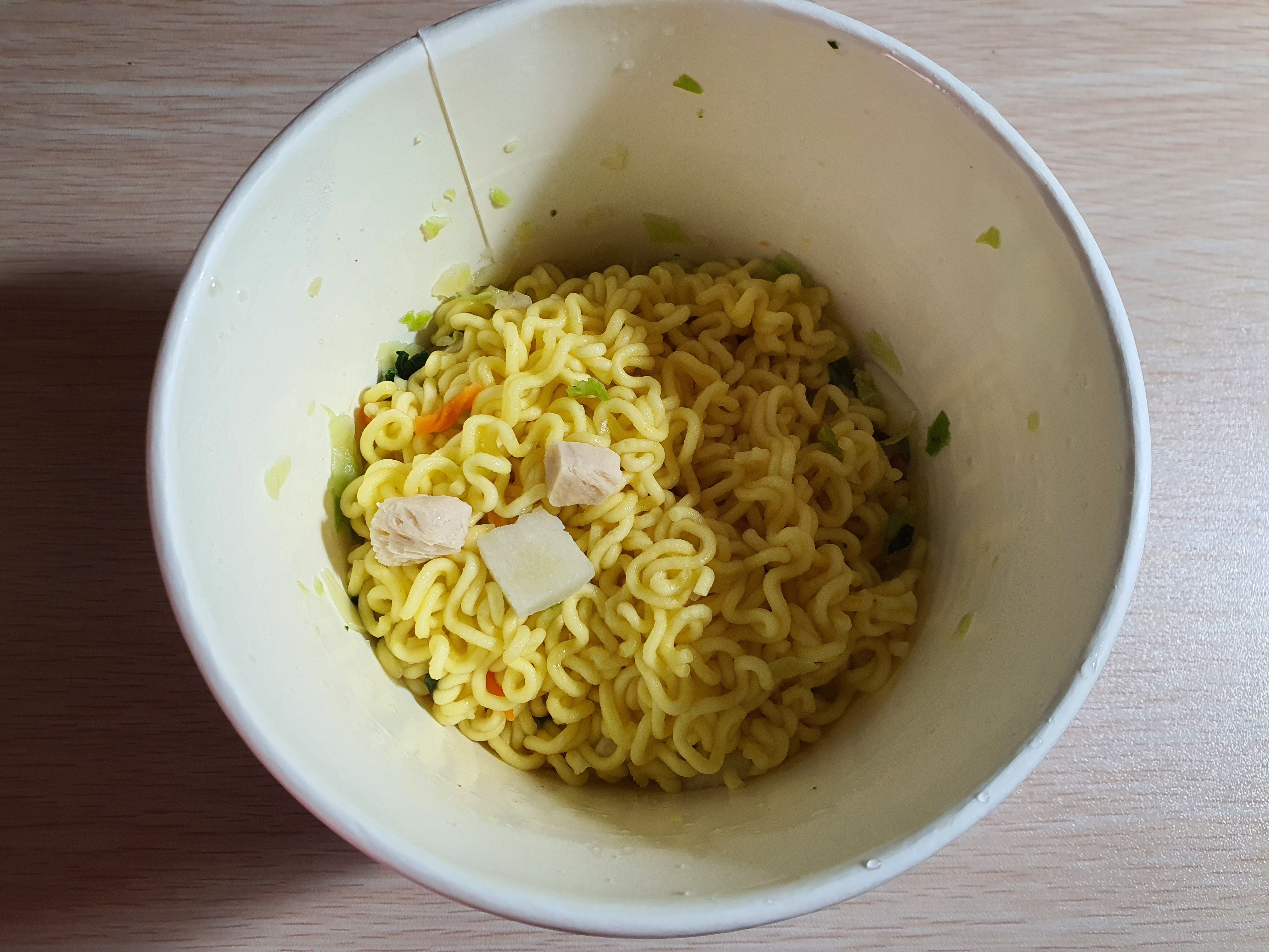 뜨거운물을 붓고 건더기스프를 넣어준후에 4분간 익혀주고 물을 따라낸후 비벼먹으면 됩니다.
