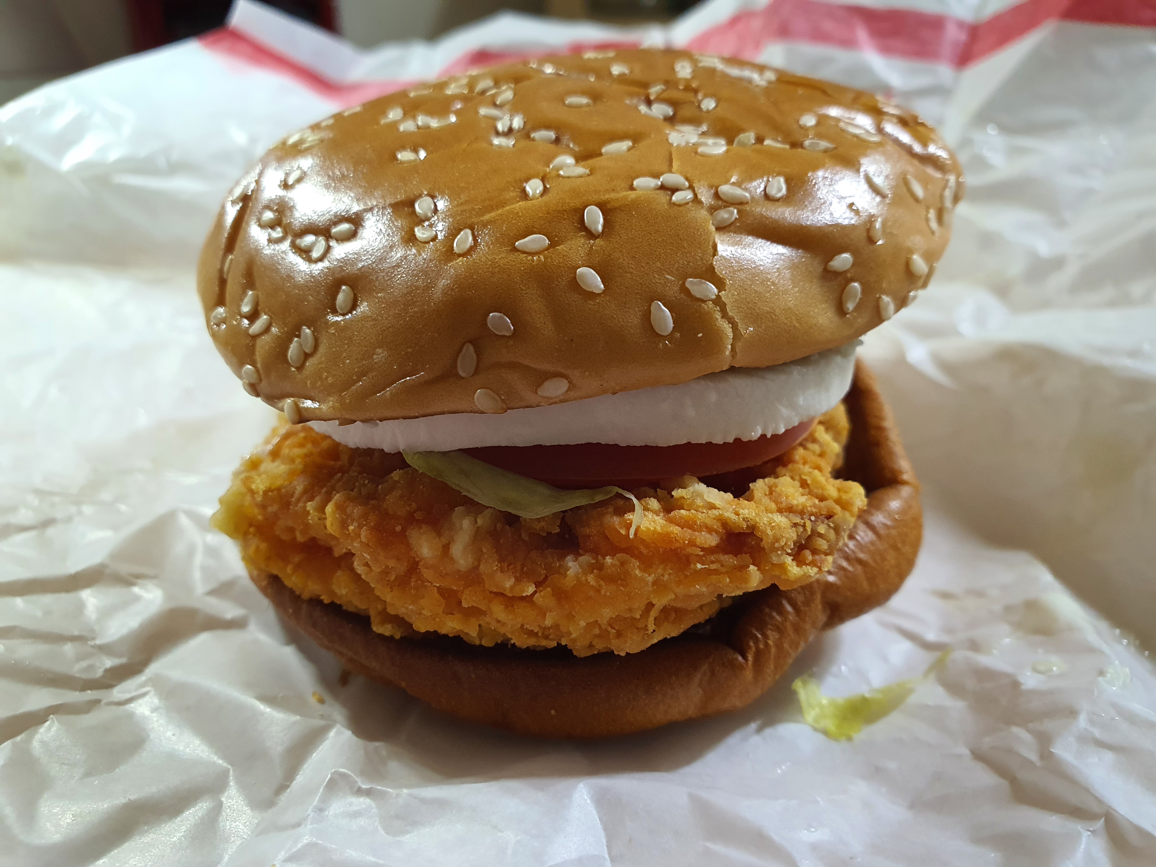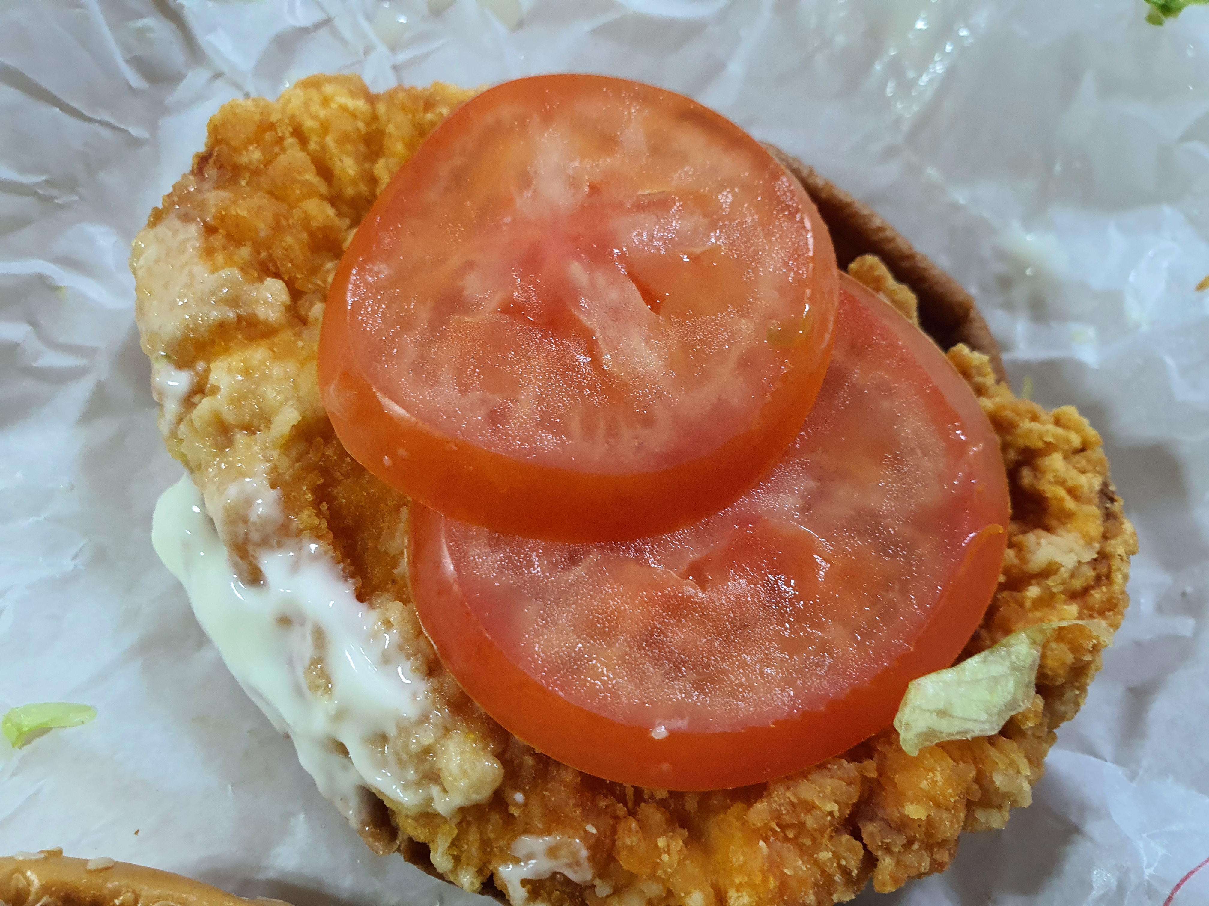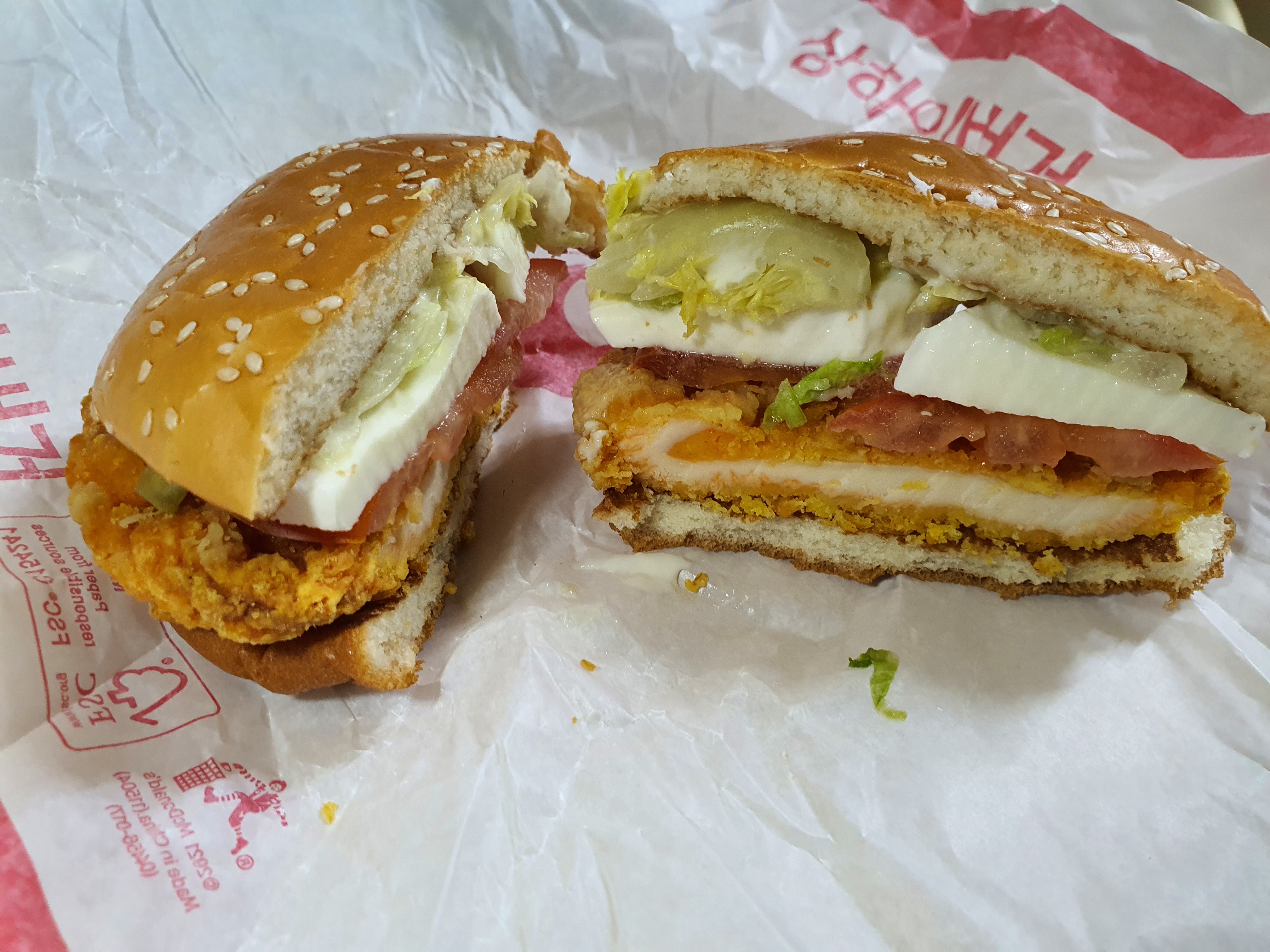시간이 지나면서 살짝 말라 비틀어진 치킨패티와 함께 빈약한 소스가 조화를 이루고 있네요.