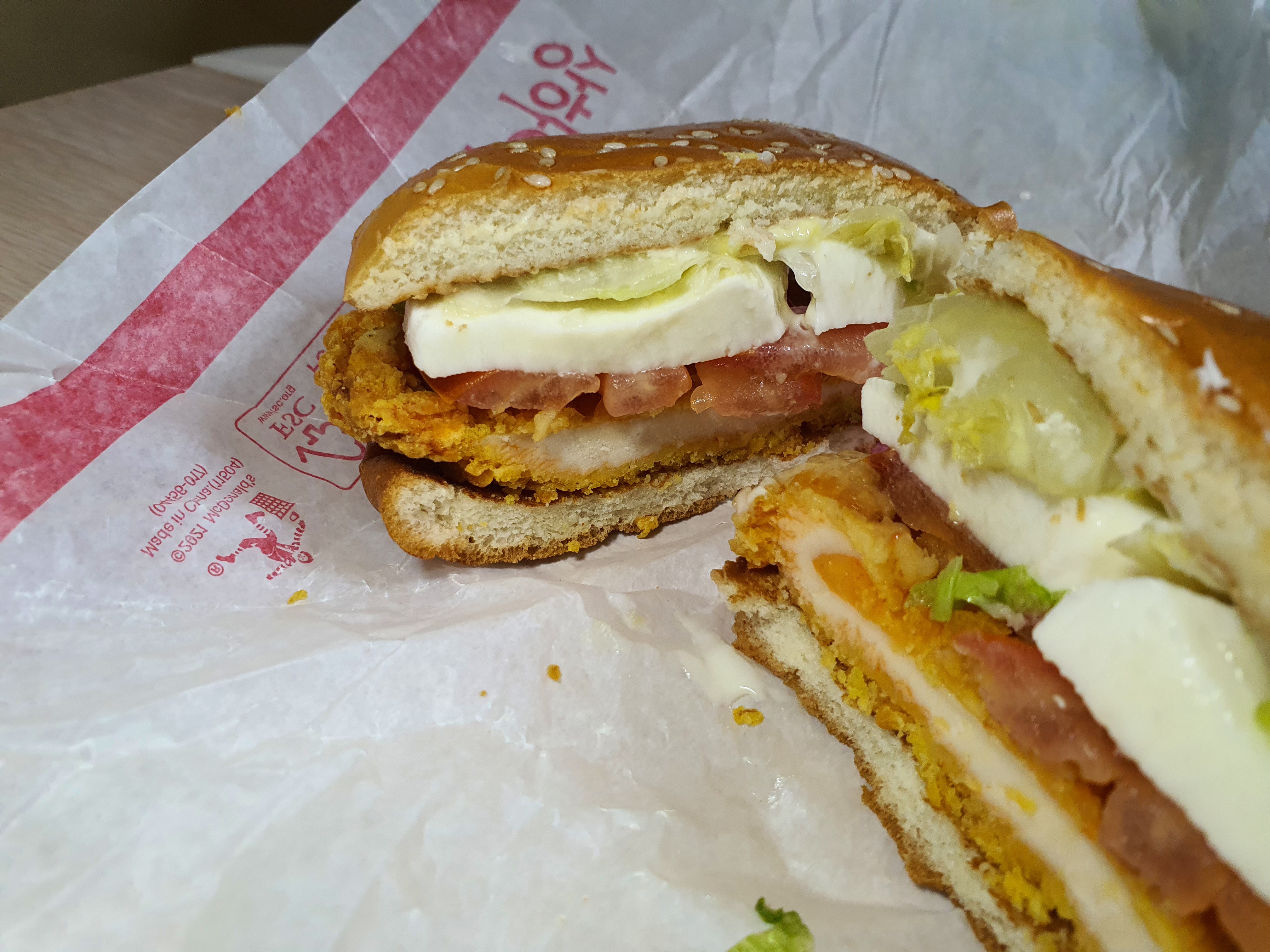 한번 먹어보니 여전히 살짝 말라붙은 치킨패티가 조금 거슬리긴 하지만 그래도 모짜렐라 치즈의 힘으로 무사히 삼키는데 성공했습니다.