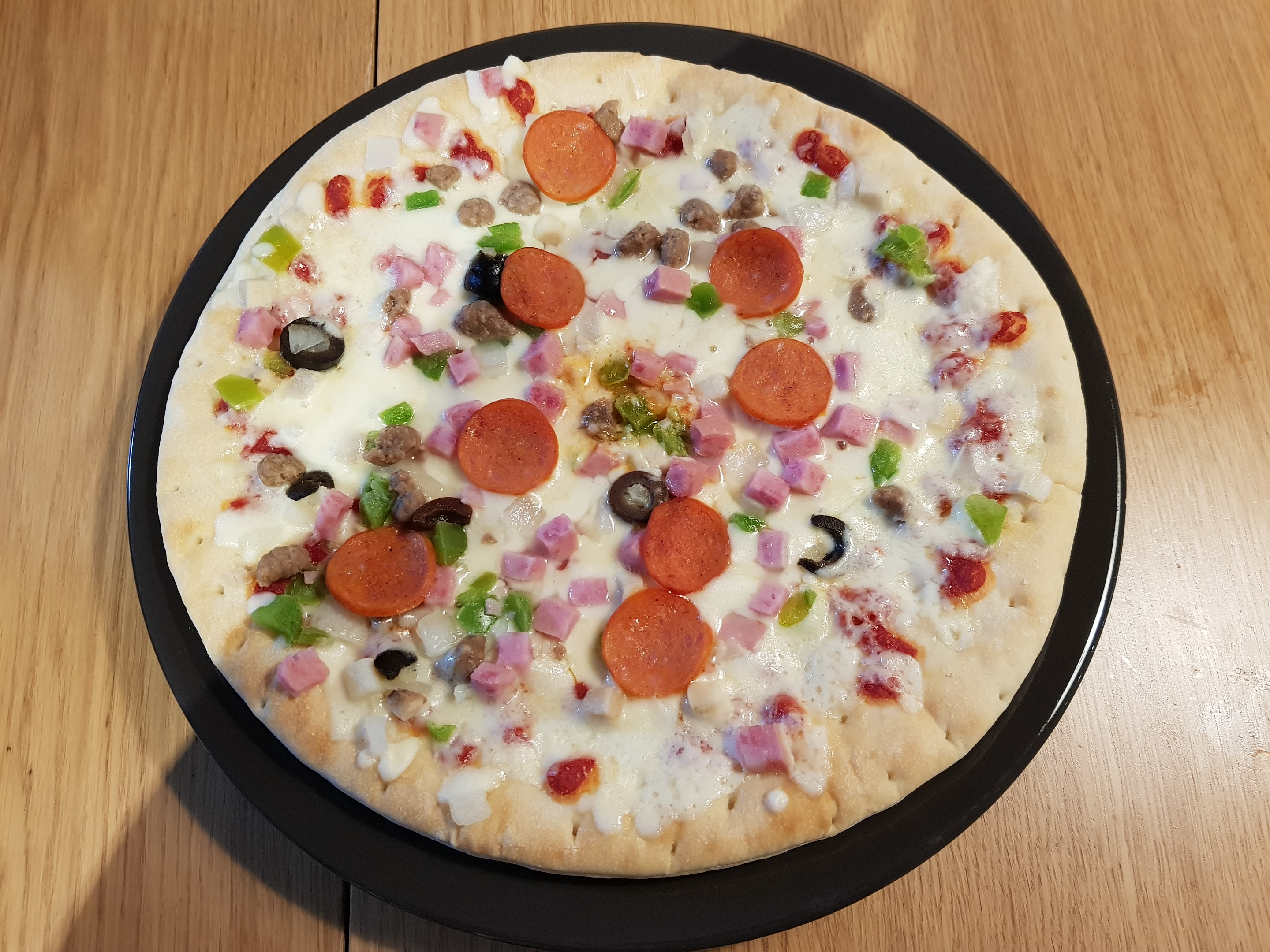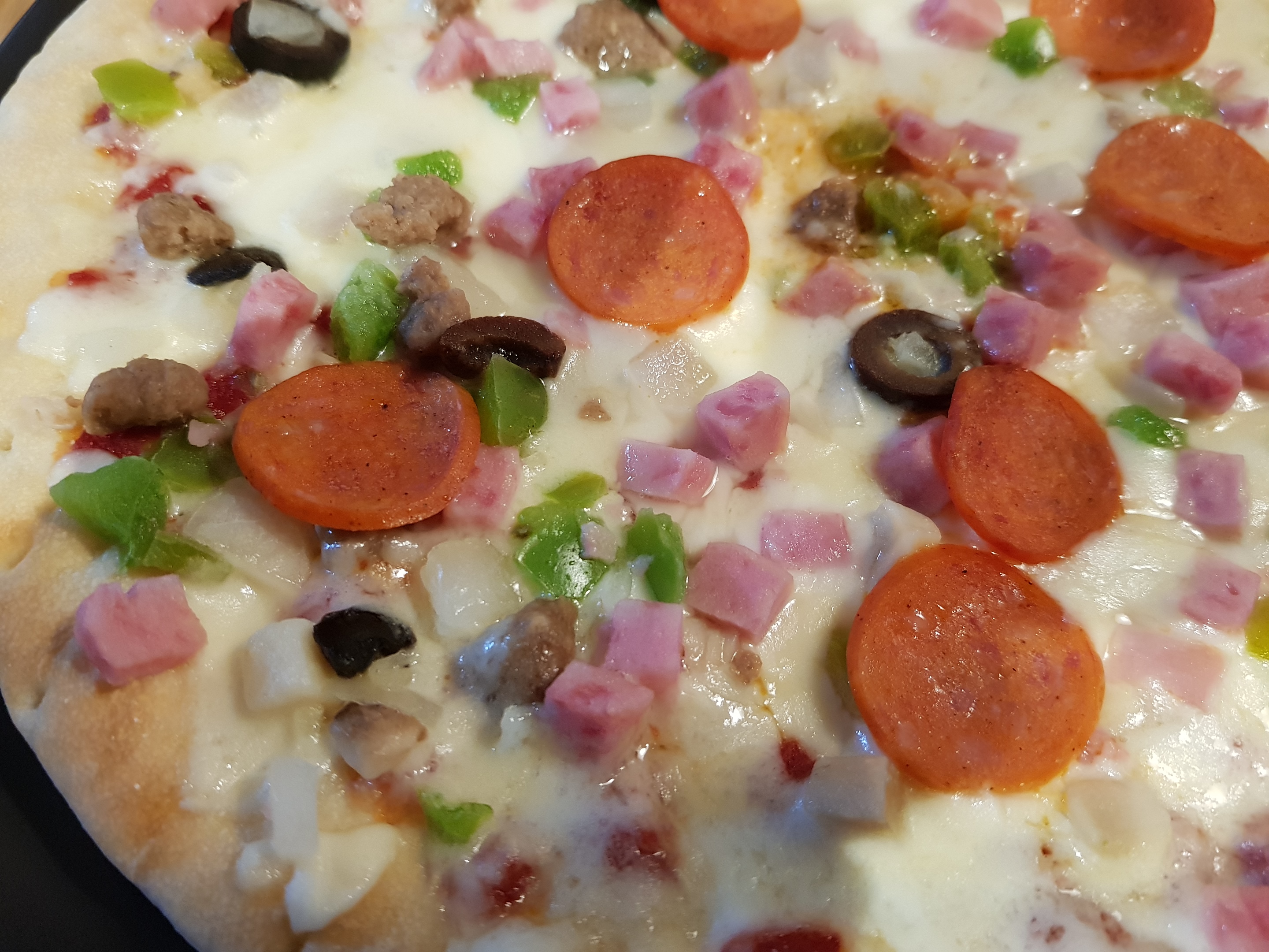 토핑도 햄과 피망, 올리브, 페퍼로니, 고기와 버섯까지 종류도 많긴 하네요.