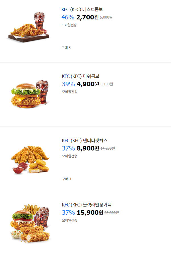 여기에서는 베스트콤보와 타워콤보가 좋아보이네요. 지마켓을 통해 구입한 온라인쿠폰은 할인폭이 꽤 괜찮은 편이니, KFC에 직접 방문하기 전에 온라인으로 할인폭을 확인하고 구입하시는 것도 좋겠습니다.