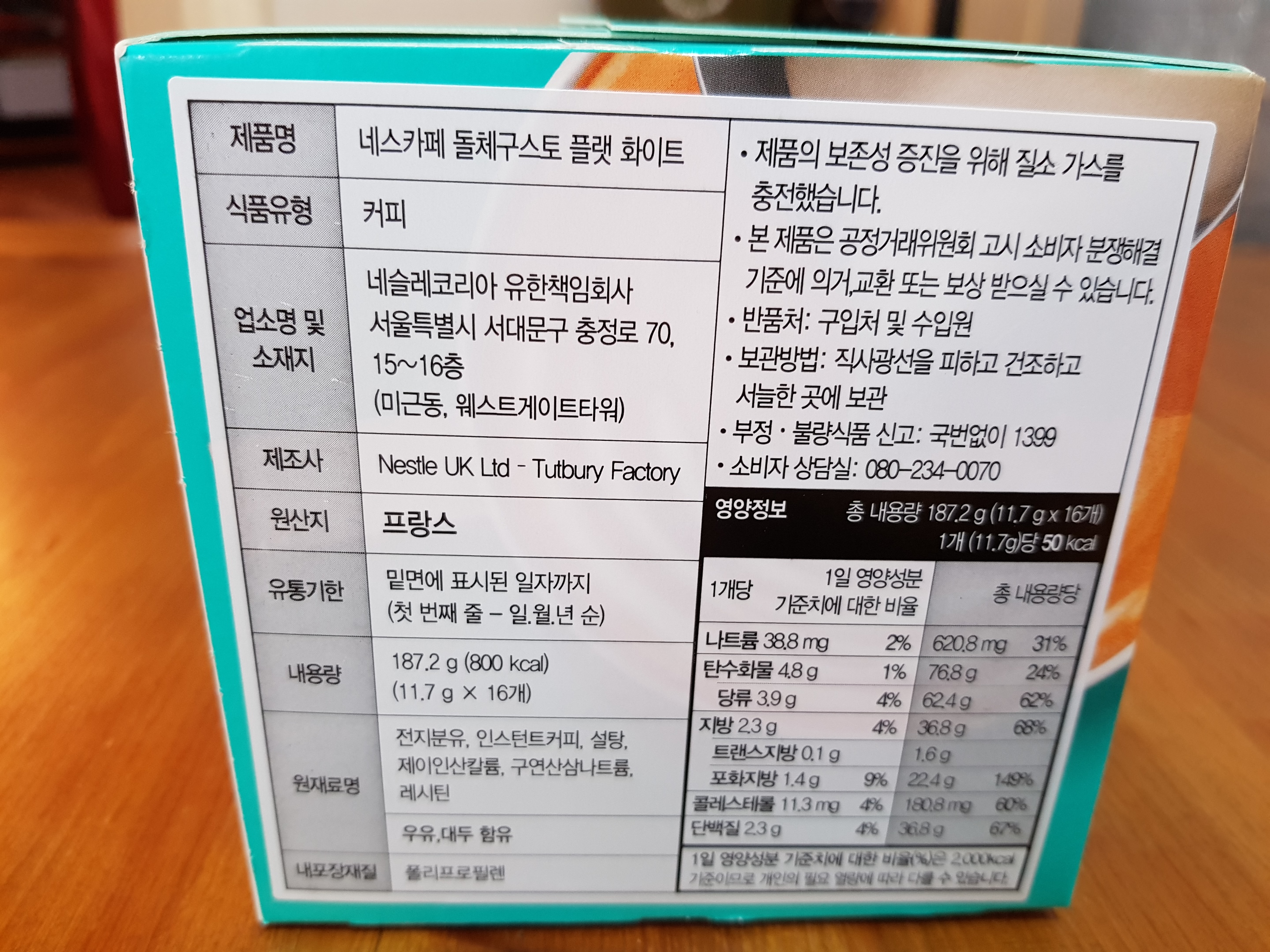 상자 상단에는 플랫화이트의 이름과 물의 양이 나와있습니다.