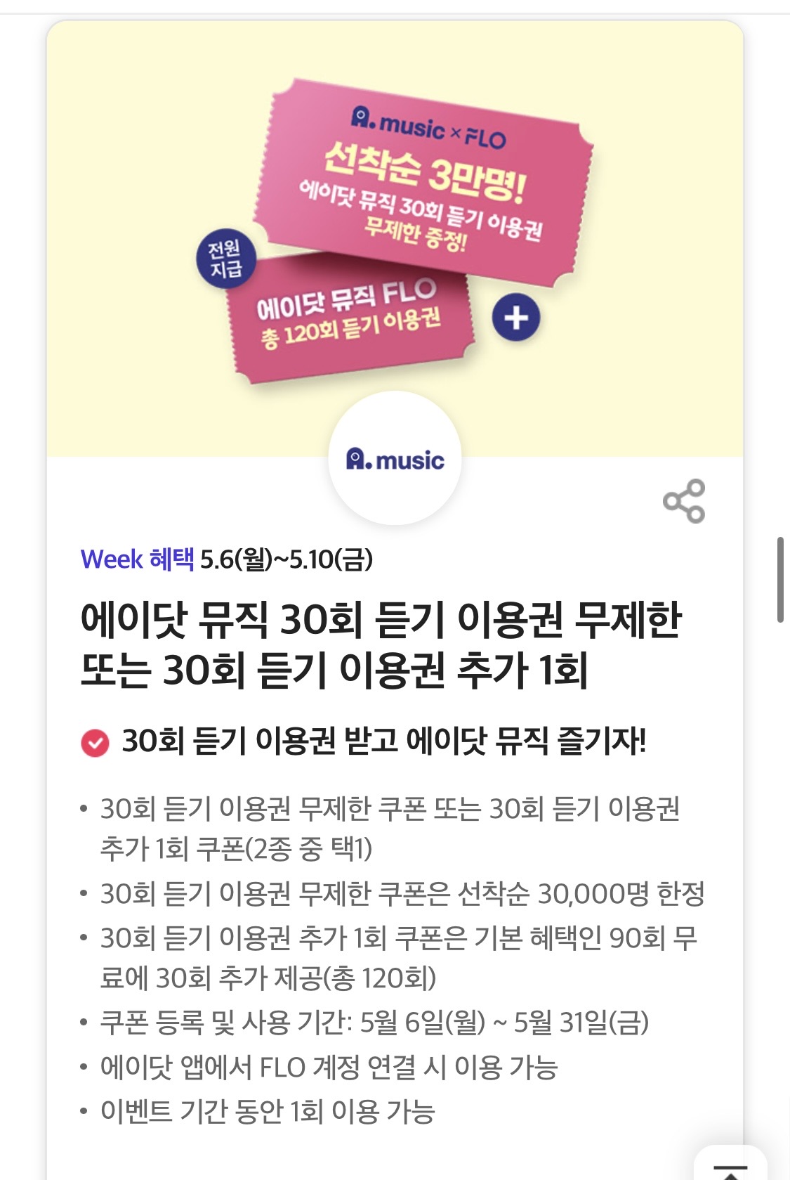하지만 에이닷 앱에서 FLO계정을 연결시에 이용할수 있다는 제한이 있긴 하지만 이용권을 증정한다는 것만으로도 나름 괜찮겠네요.