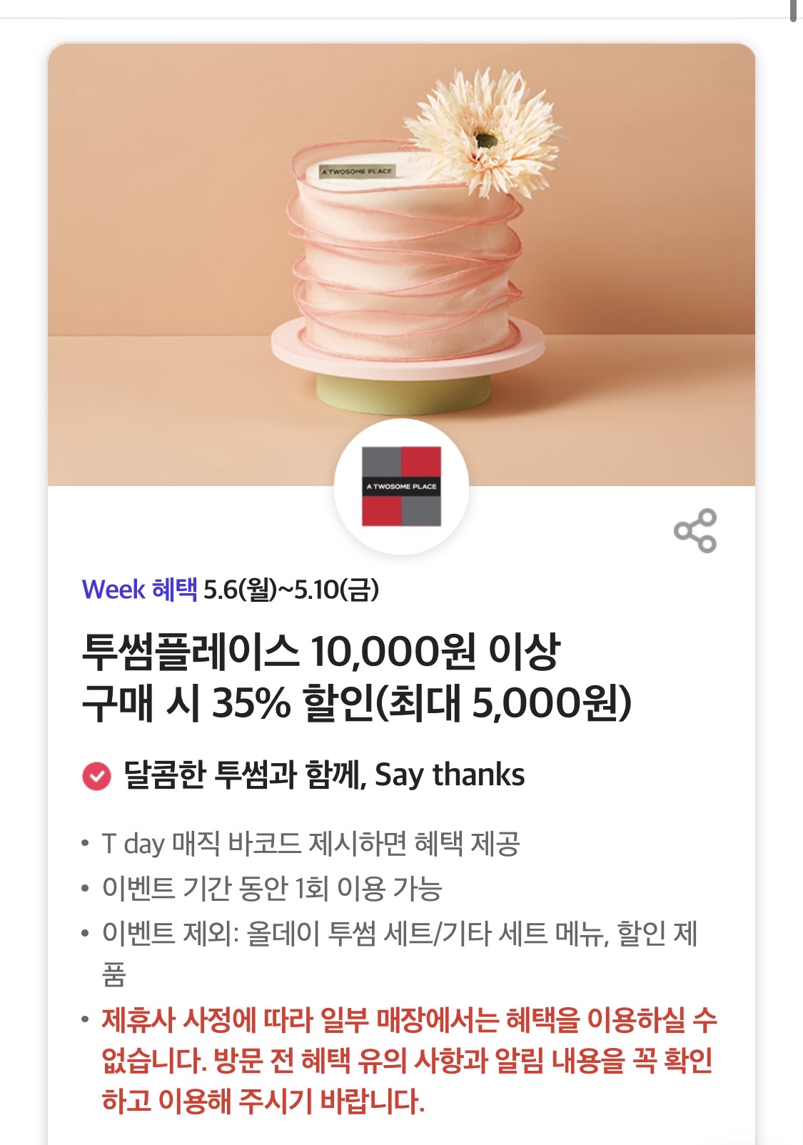 그리고 투썸플레이스에서 만원이상 구입시에 35퍼센트 할인받을수 있다고 합니다.