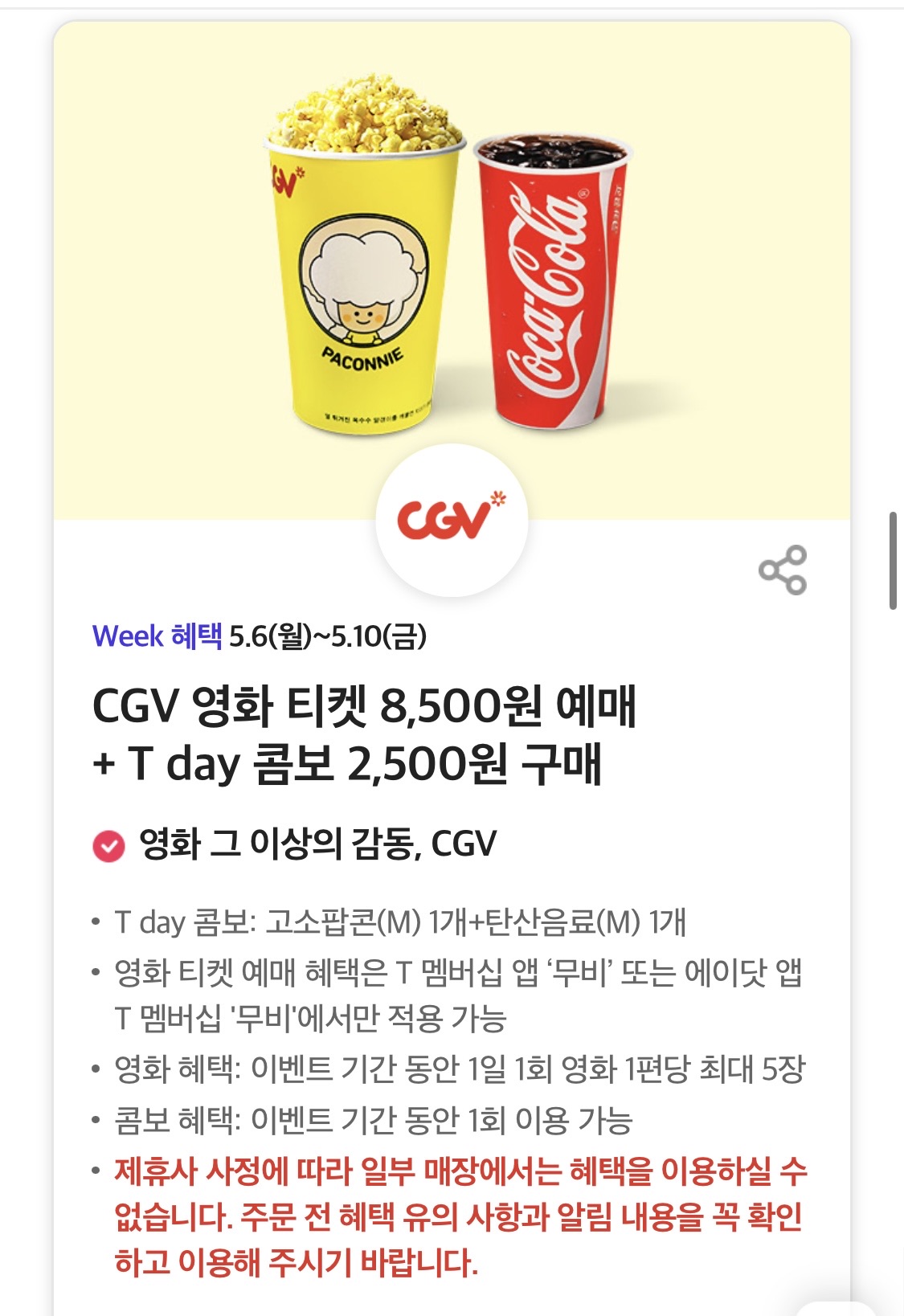 CGV에서 영화티켓을 8500원으로 예매할수 있고, 팝콘과 음료가 포함된 콤보를 2500원으로 구입할수 있으니 오늘 한번 저렴한 가격으로 영화를 즐겨보는것도 좋겠습니다.