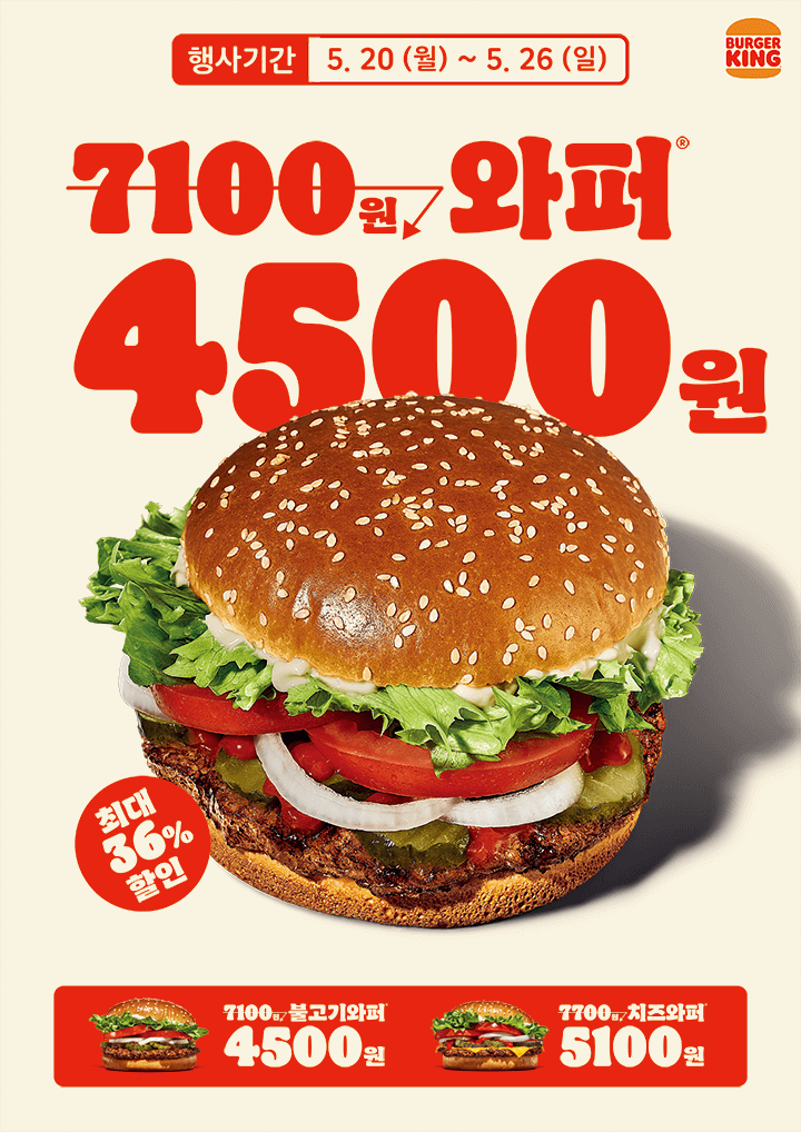 얼마전 뉴와퍼를 출시하면서 단품가격이 4천원이었는데, 이제는 다시 평소와 비슷한 4500원의 가격으로 돌아온 모습입니다. 거기에 불고기와퍼와 치즈와퍼로 이어지는 완벽한 할인콤보 역시 이전과 동일한 점입니다.