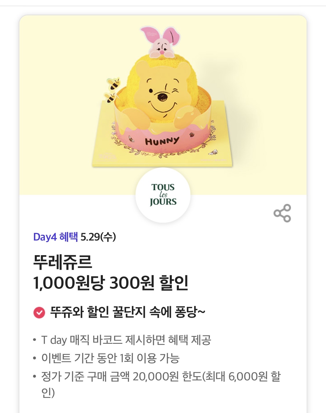 그리고 T멤버십 T데이 행사에서 거의 빠지지 않는 뚜레쥬르 할인도 계속됩니다.