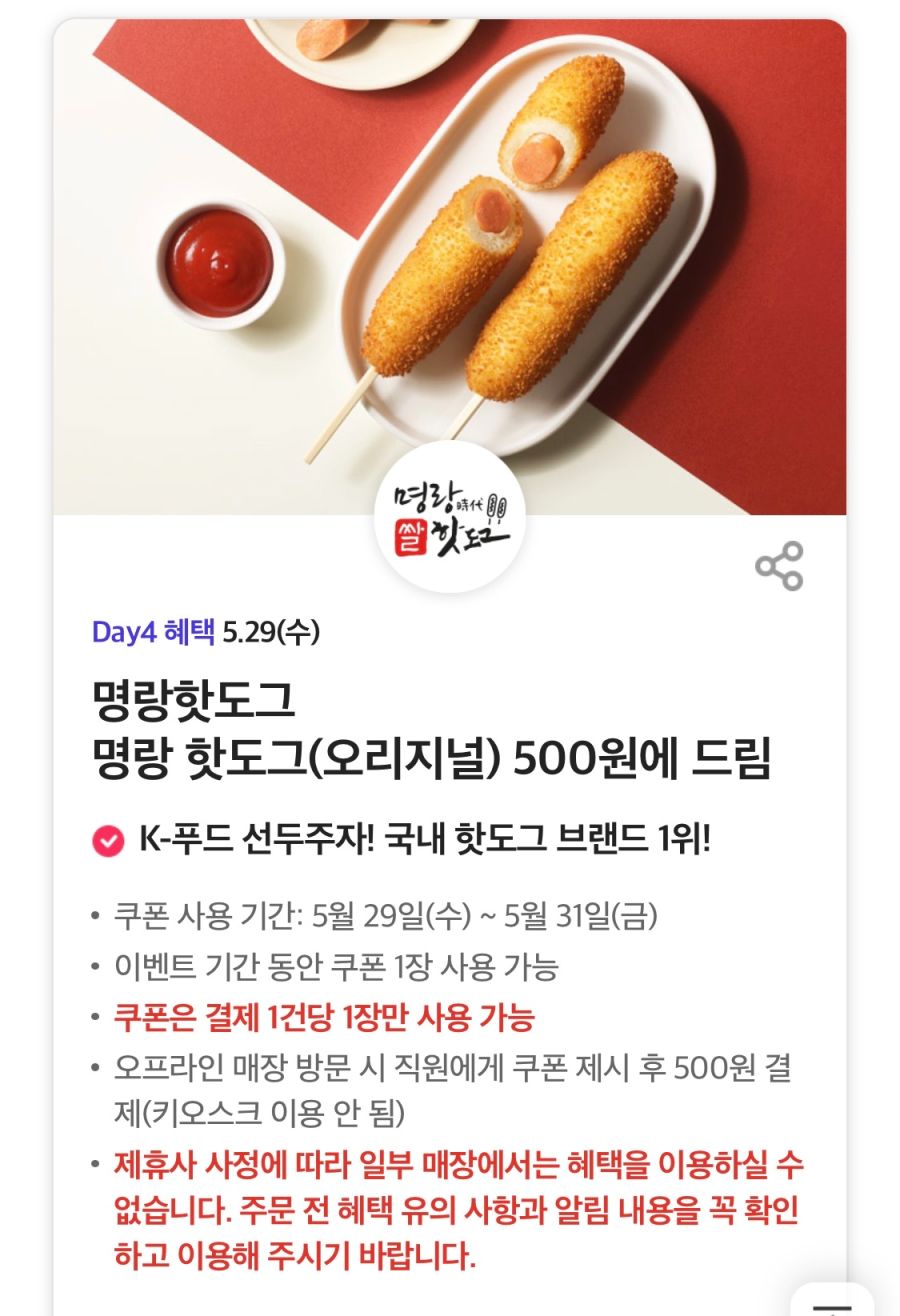 이쯤되면 차라리 뚜레쥬르나 편의점에서 적용하듯 어느정도 이상으로 결제했을때 할인이 적용되는 것이 좀더 좋아보이네요. 명랑핫도그가 판매하는 오리지널 제품은 저렴한 가격으로 다른 제품보다 약간 부실한 모습을 보이는데, 이 제품에만 할인이 적용된다는 점도 아쉽긴 합니다.
