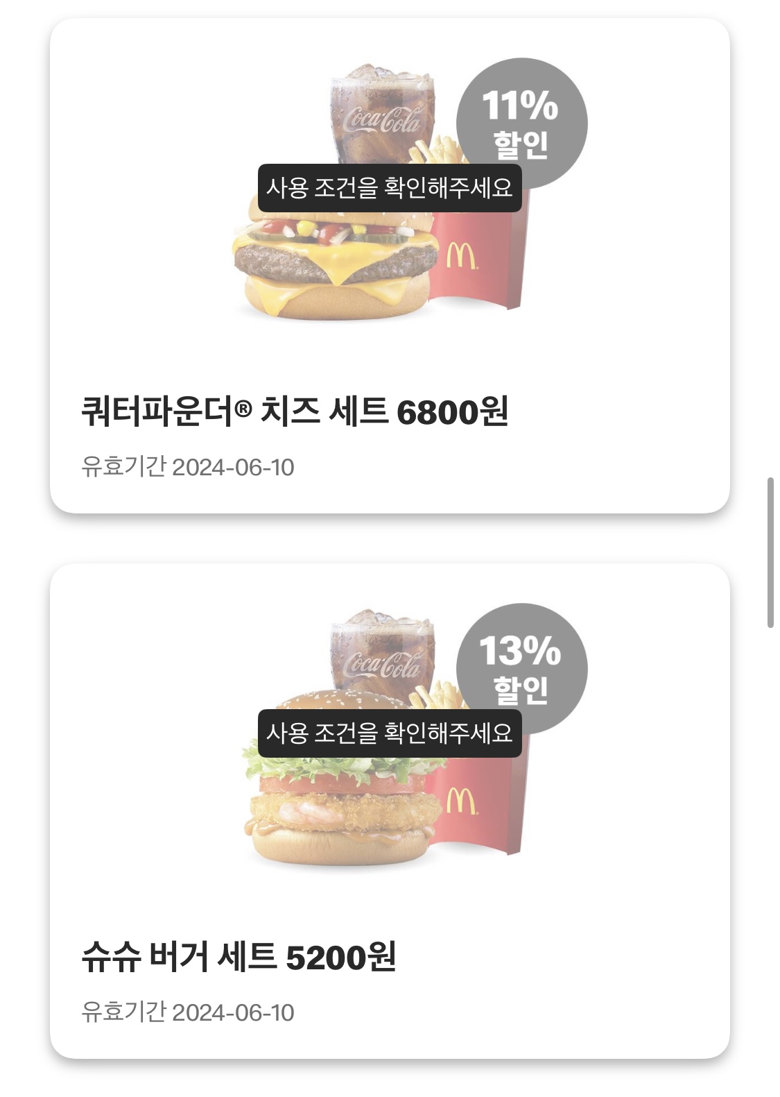 쿼터파운더치즈 세트가 6800원, 슈슈버거 세트가 5200원의 가격으로 할인되니 상당히 좋은 가성비를 보여주네요.