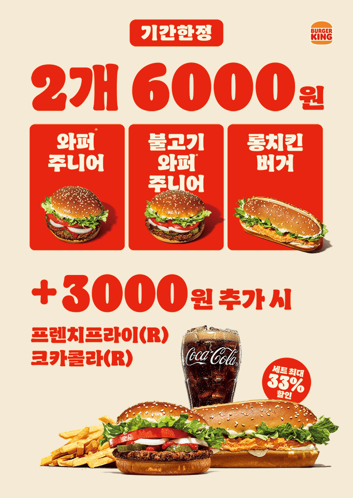 거기에 여전히 버거킹이 밀고있는 3천원을 추가하면 감자와 콜라가 추가되는 점도 동일하네요.