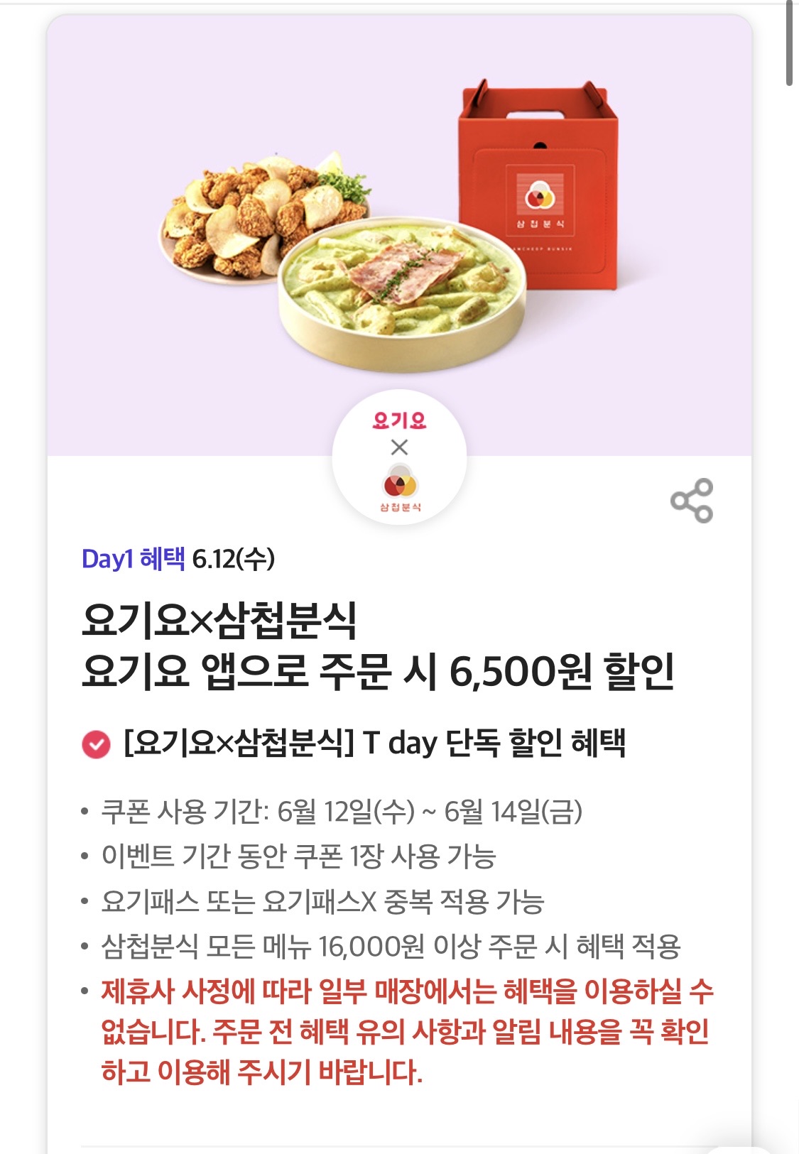 수요일부터 금요일까지 쿠폰을 제공하며, 요기요를 이용해 삼첩분식에 주문하면 6500원의 할인을 받을수 있습니다.