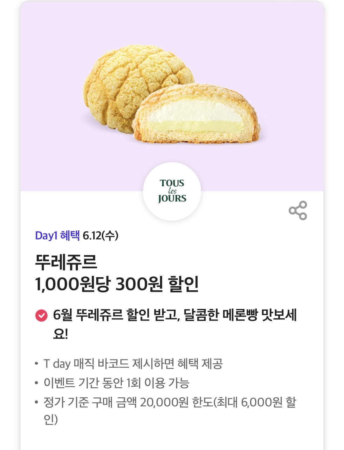 T멤버십 T데이에 제공되는 매직바코드를 이용해 주문했을때 할인이 적용되며, 2만원 한도내에서 최대 6천원까지 할인이 된다고 하니 이번에도 뚜레쥬르 할인을 적용해보는것도 좋겠습니다.