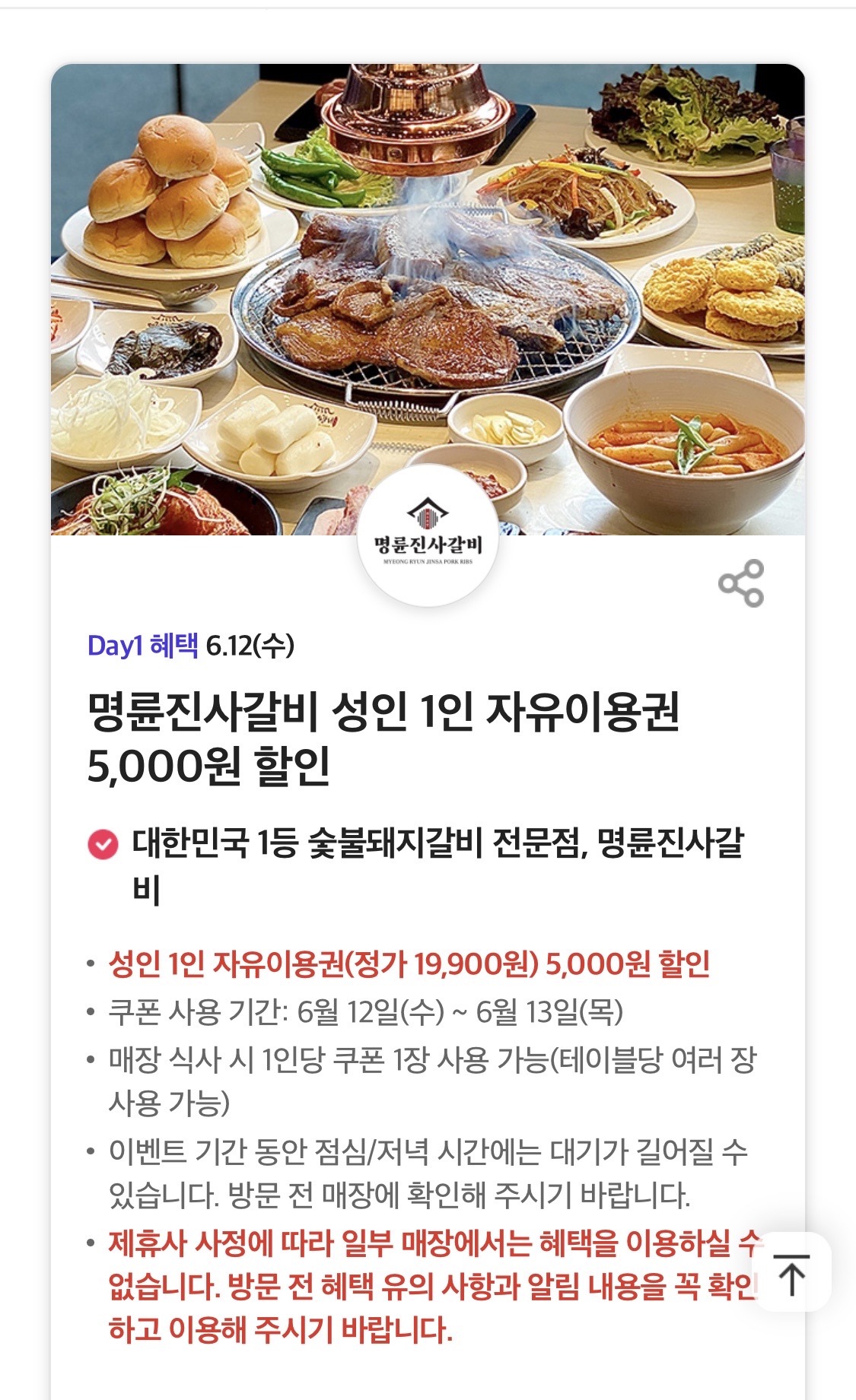 명륜진사갈비의 성인 1인 자유이용권이 19900원의 가격인데, 여기에서 5천원의 할인을 받을수 있다고 합니다.