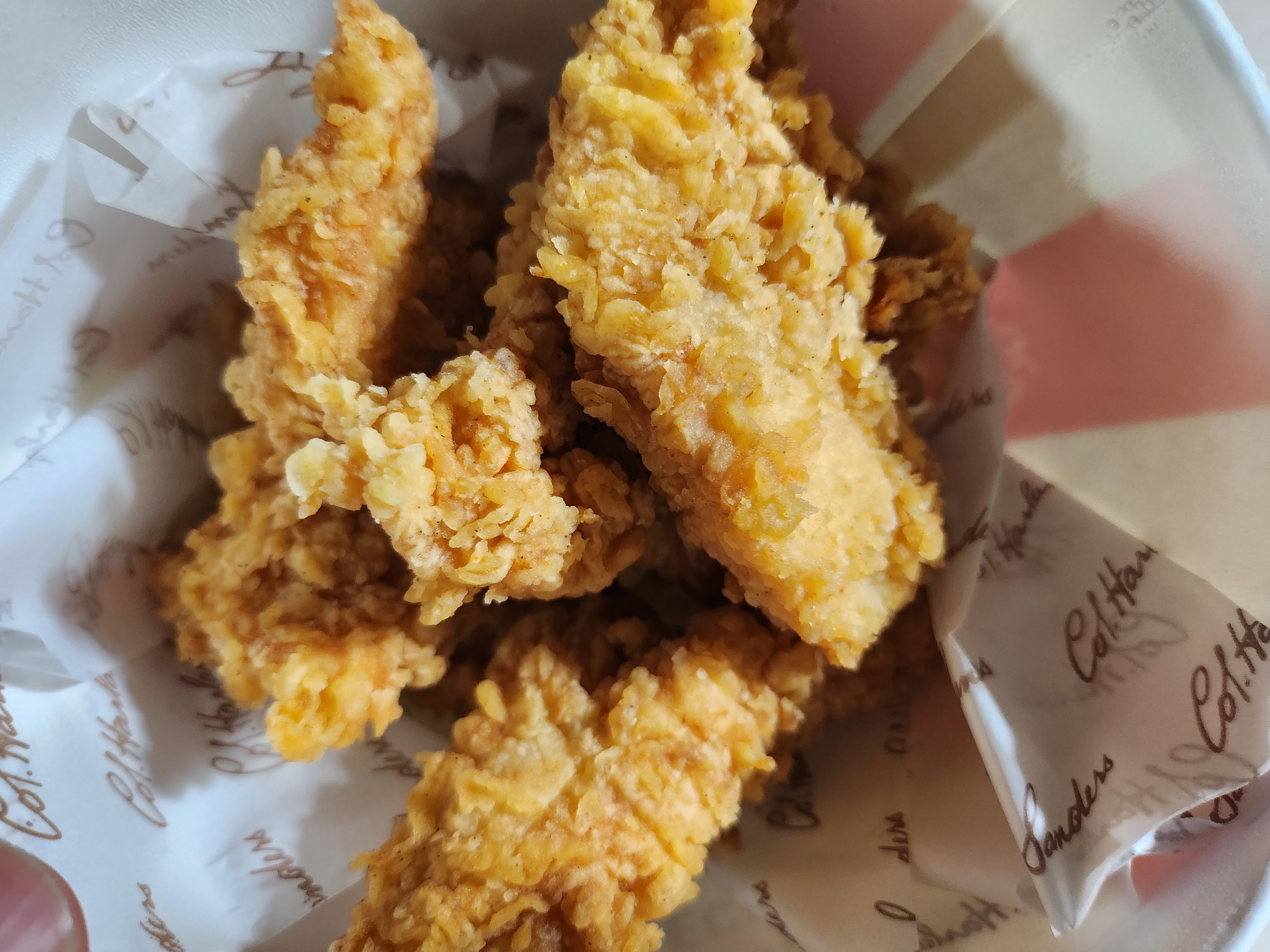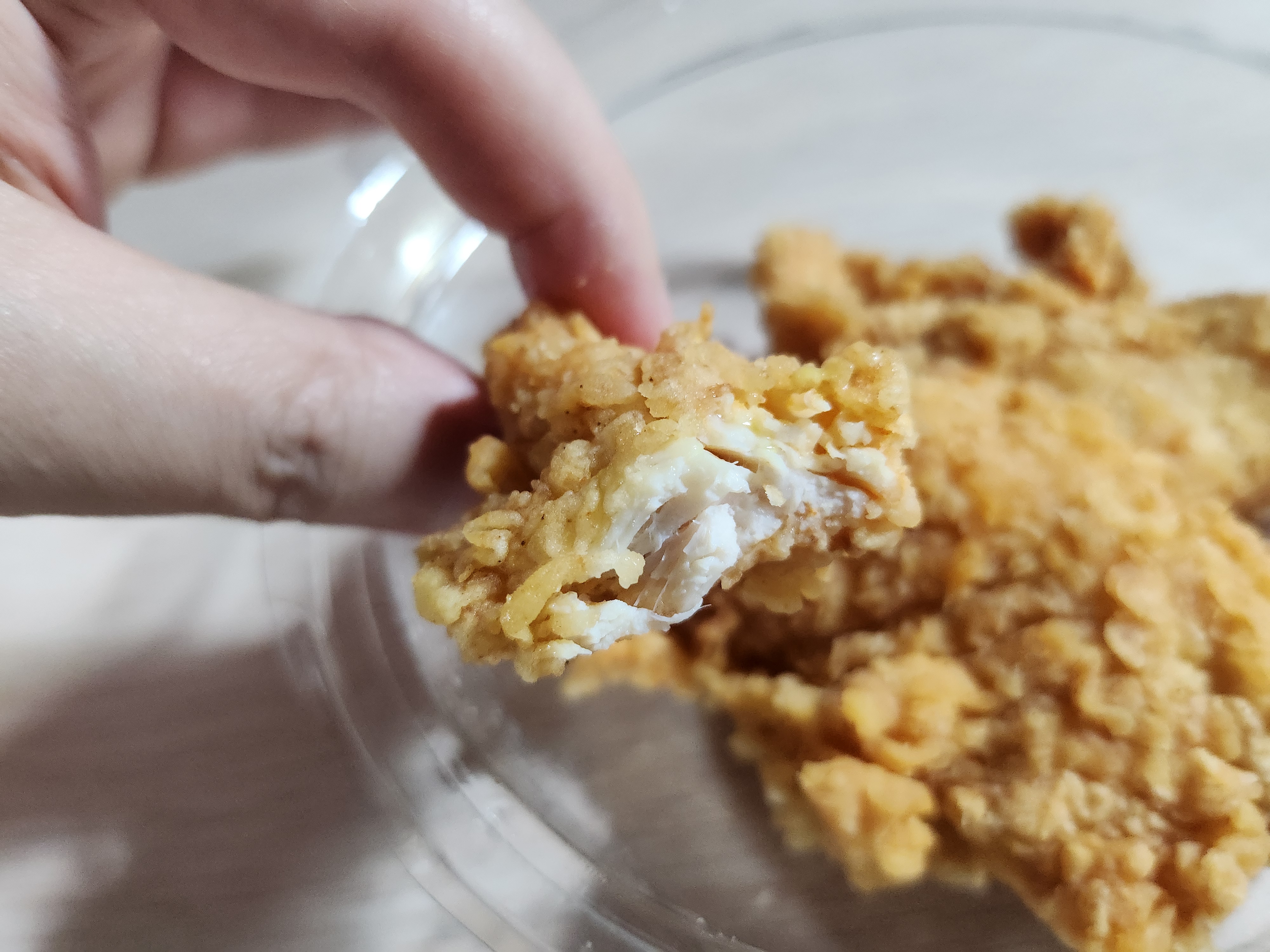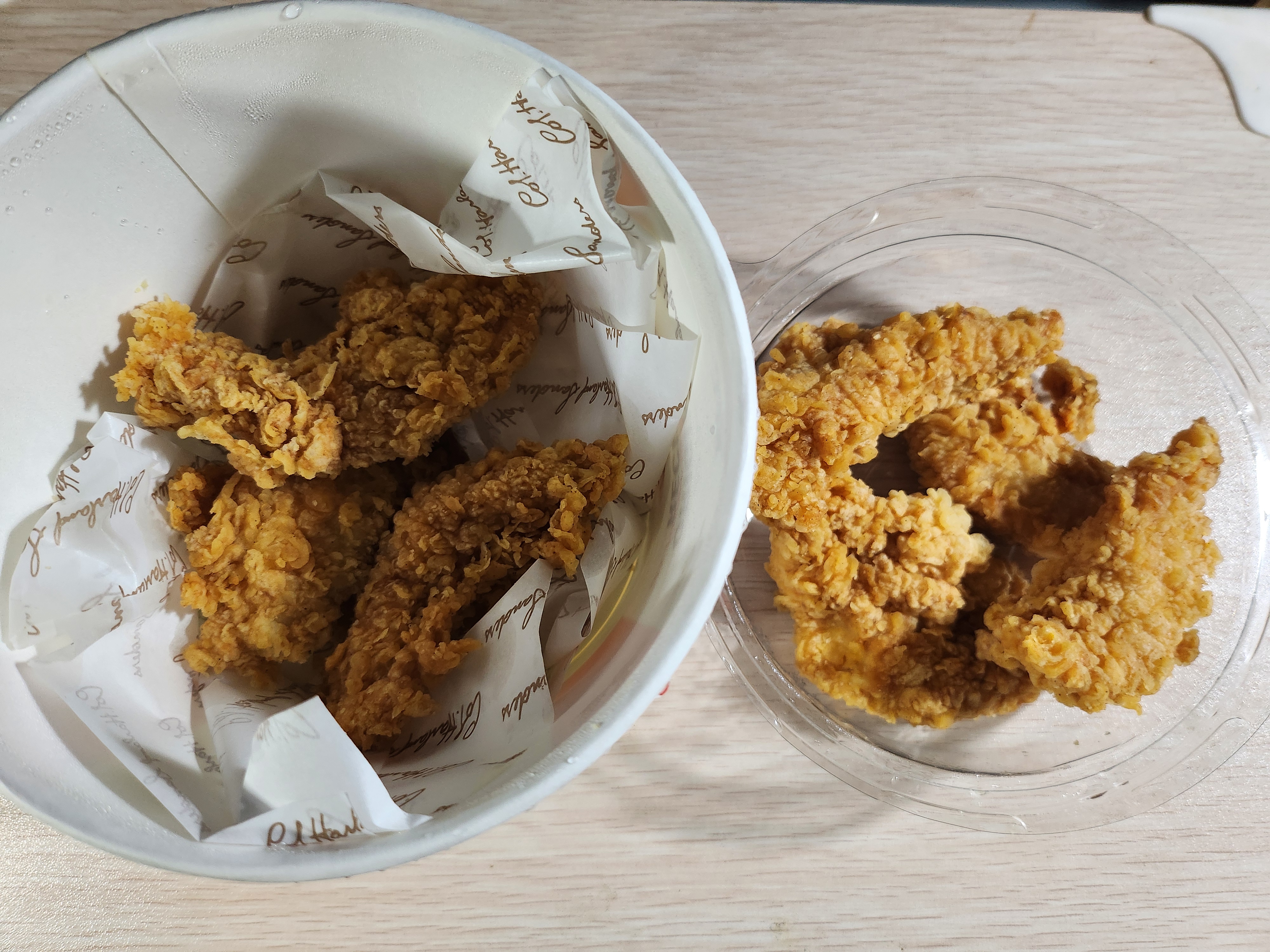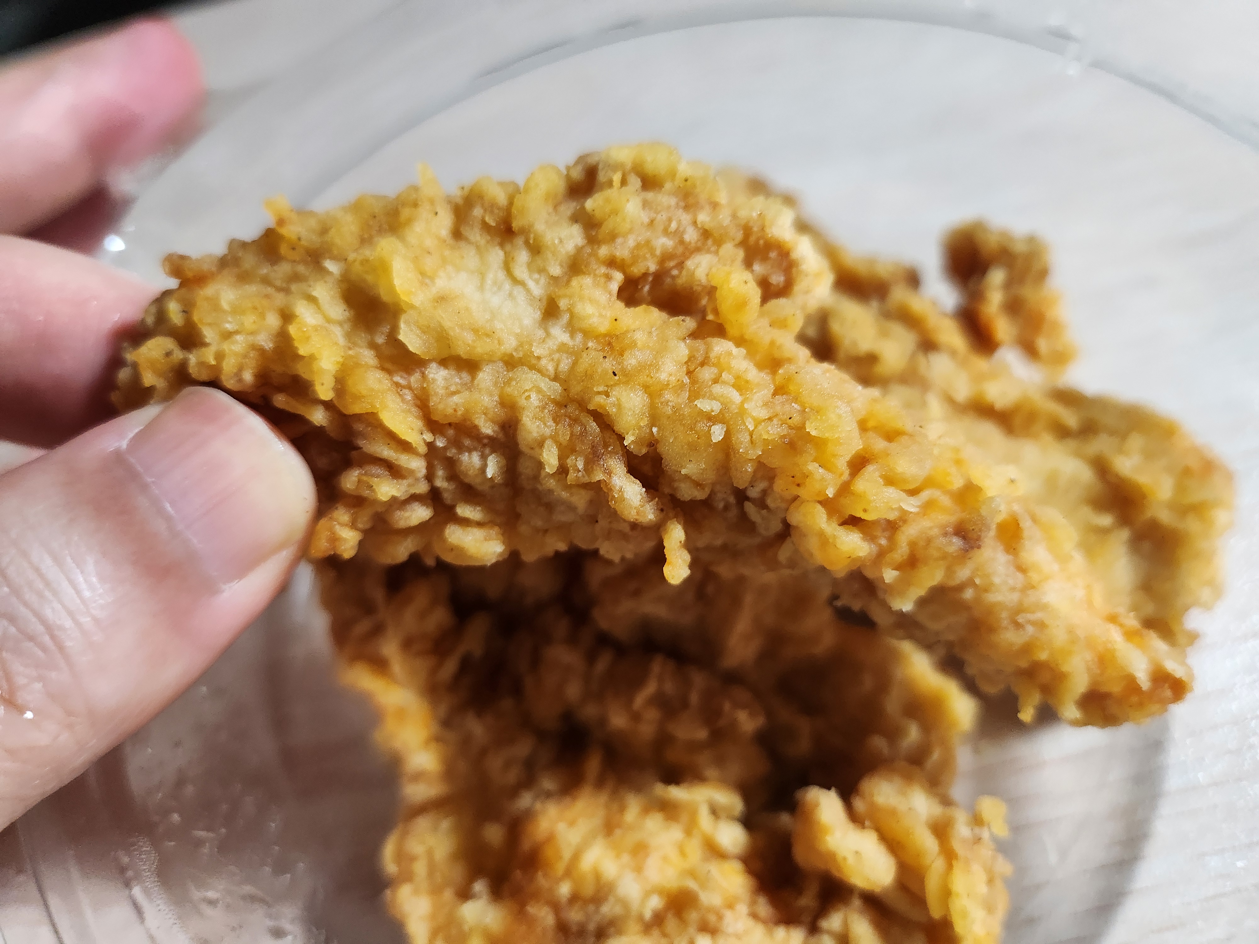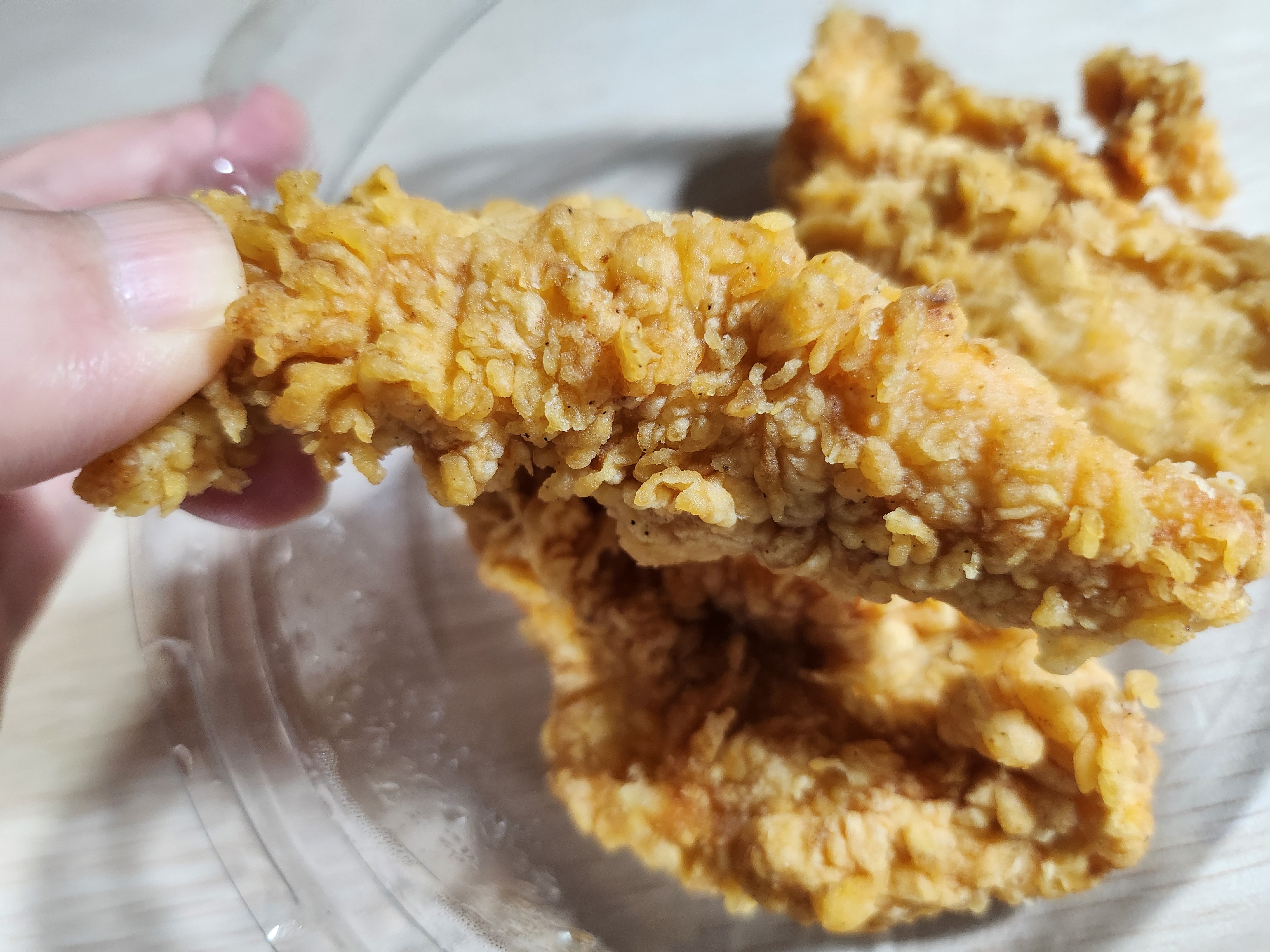 묵직하고 큼지막한 텐더가 네개, 뭔가 약간 부실하고 가벼운 조각이 세개 들어있는 모습이라 이정도면 충분히 괜찮다고 봅니다.