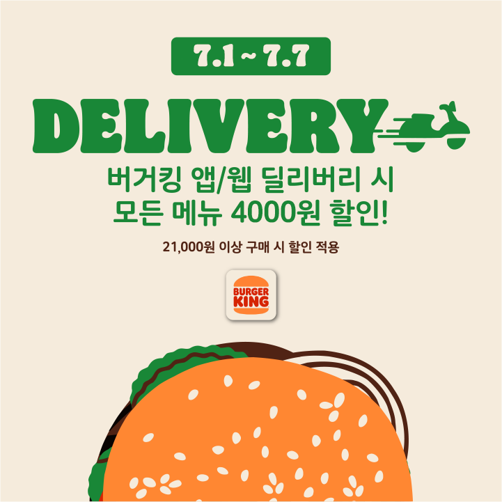 그리고 이번주 동안에는 버거킹의 앱과 웹페이지를 통해 배달주문할때 모든 메뉴에서 4천원의 할인을 받을수 있다고 합니다.