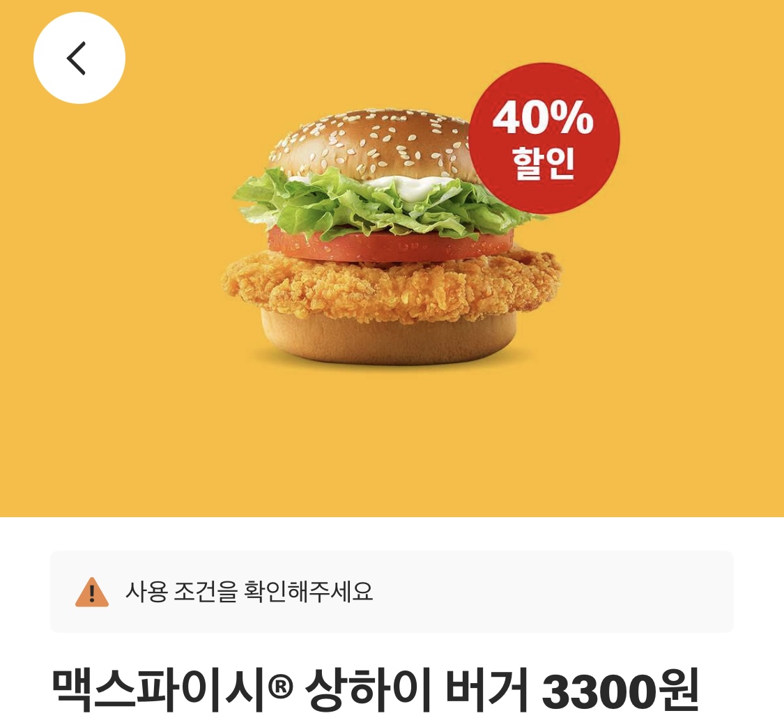 맥도날드 공식앱에서 쿠폰을 내려받으면 상하이버거를 3300원의 가격으로 구입할수 있습니다.