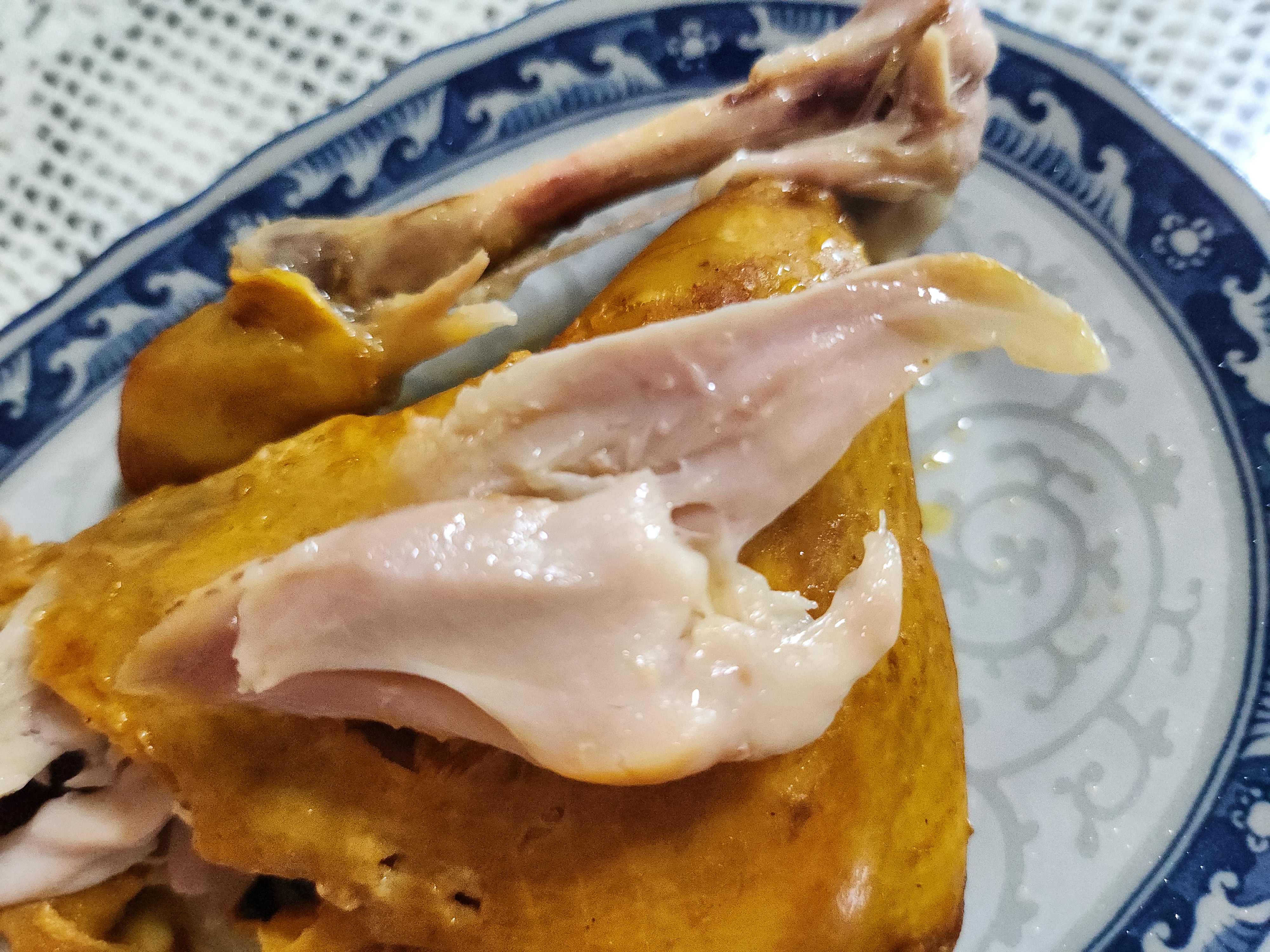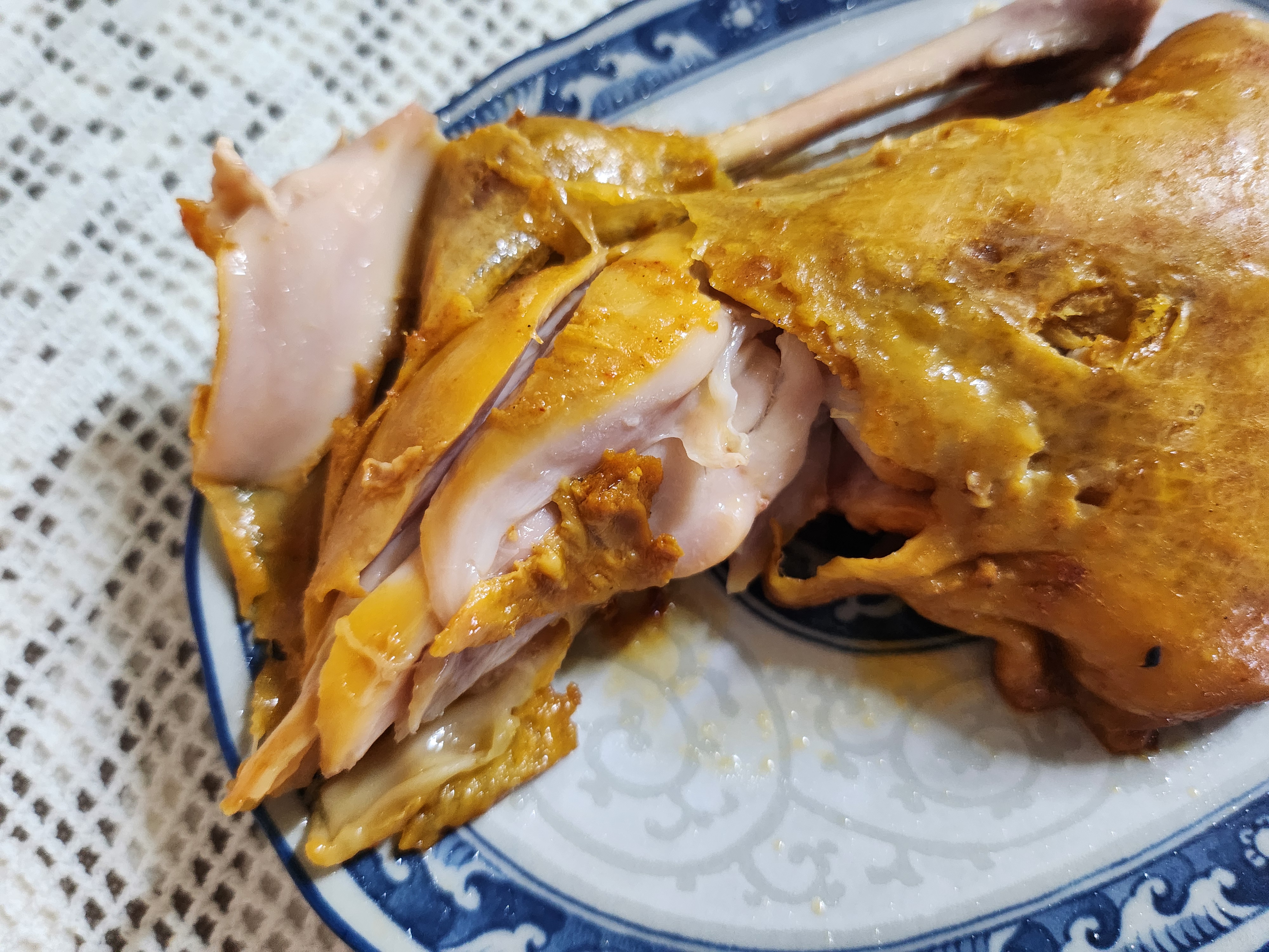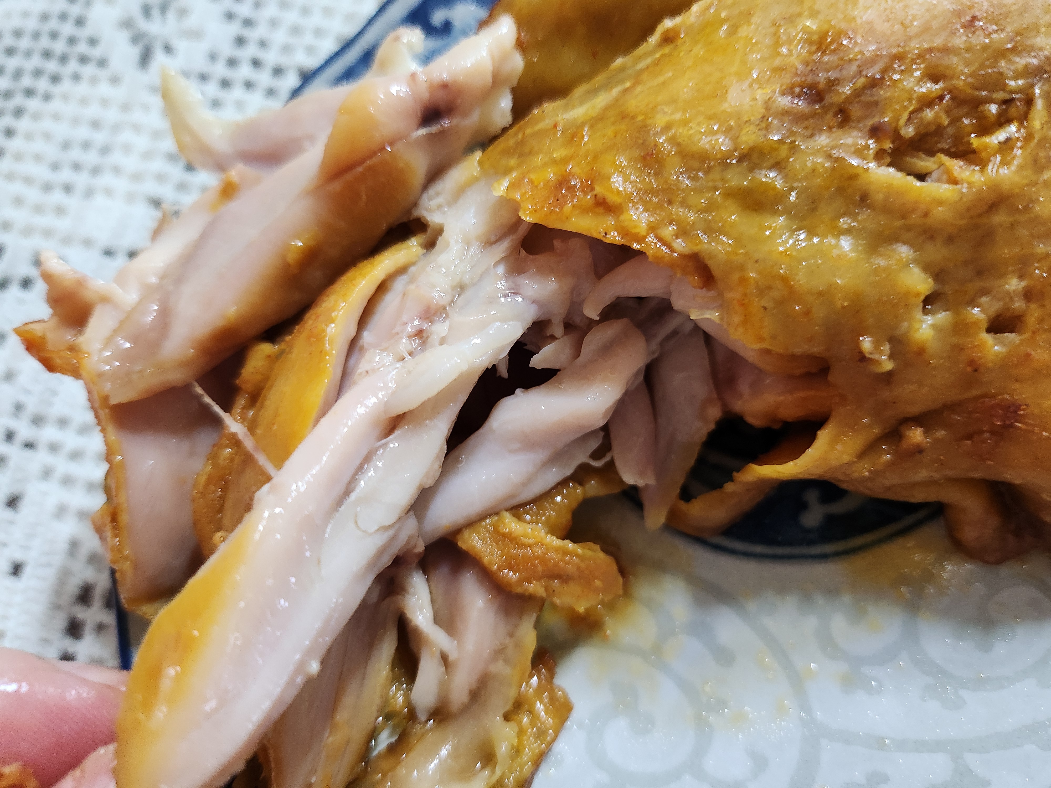 그나마 껍질쪽에서는 매콤한 맛이 미약하게 느껴지긴 하는데, 닭다리를 크게 물어뜯으면 이런 맛은 거의 느낄수 없는 수준입니다. 그래서인지 뭔가 조리가 잘못되었나 의심될 정도이고, 맛이 너무 약해서 닭고기의 풍미가 더욱 진하게 느껴지는 모습입니다.