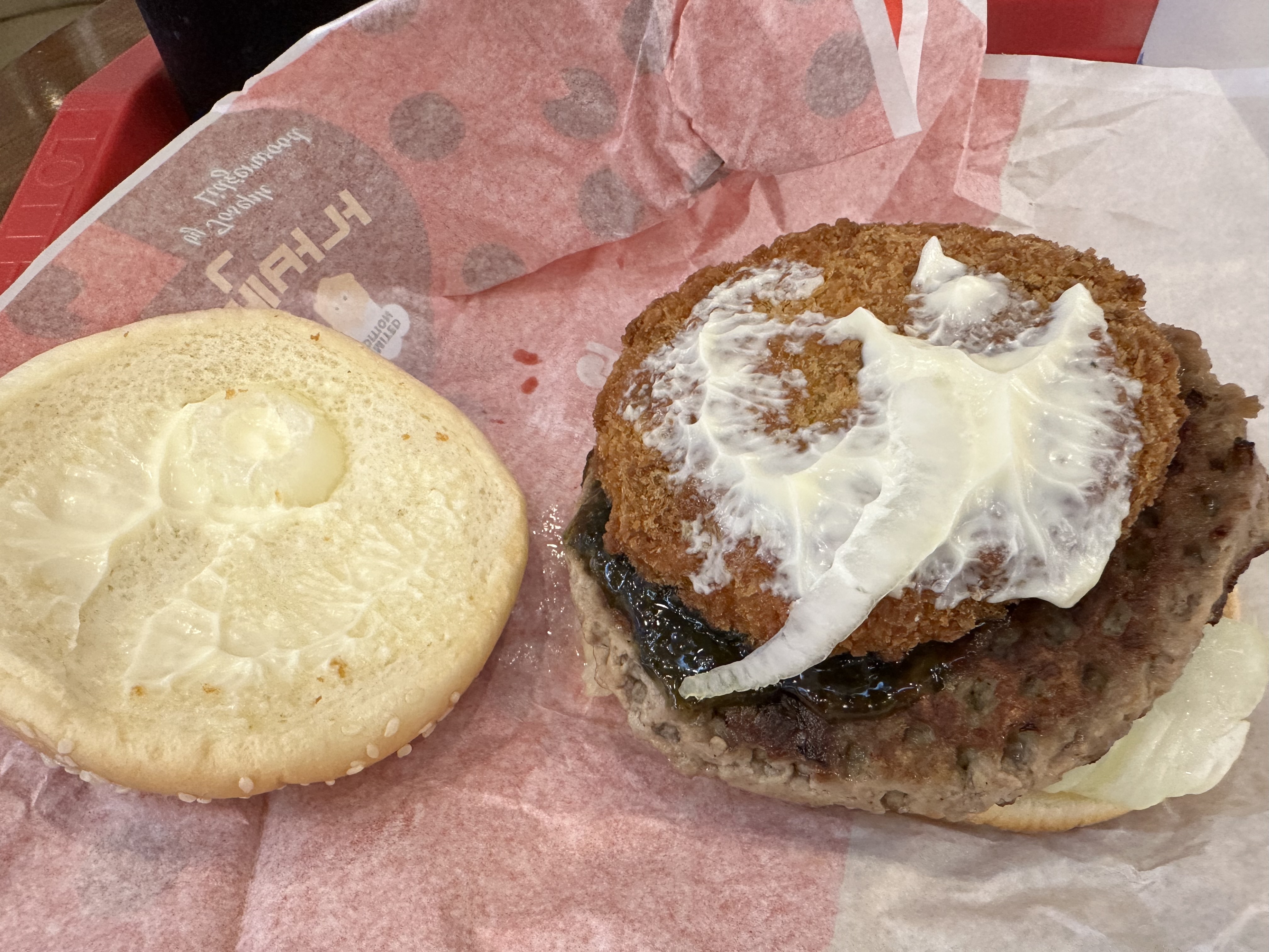 물론 두툼한 패티에서 느껴지는 다양한 맛은 좋은 편인데, 이것이 다른 재료들과 어우러져 더욱 어중간해진다는 점이 아쉬웠습니다. 이정도면 차라리 튀겨낸 패티만 따로 먹는게 좋을듯 하네요.