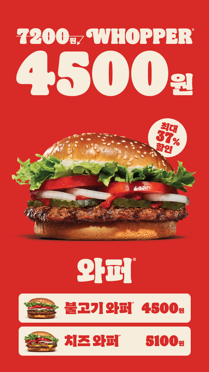 이번 와퍼행사에서는 와퍼 단품을 4500원으로 구입할수 있습니다.