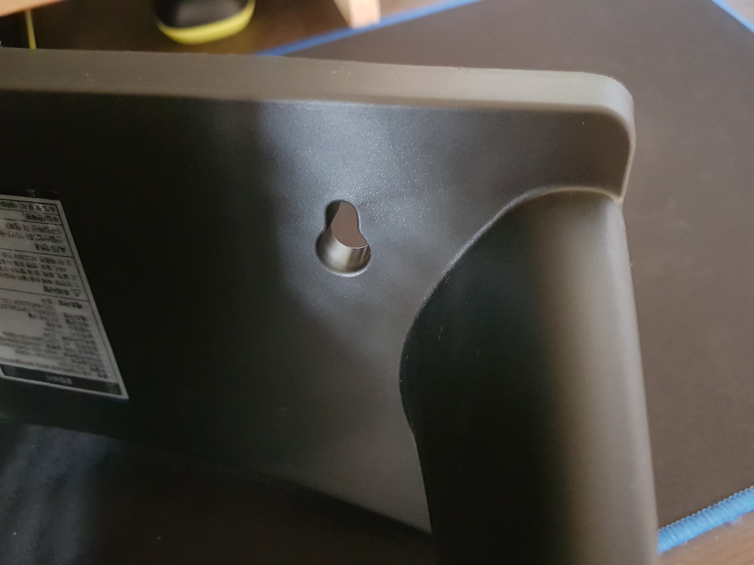 무게 때문에 벽에 걸기는 힘들겠고 바닥에 고정할때 쓰라는 건가 봅니다. 설명서에도 구멍의 용도는 따로 나오지는 않네요. 제조사가 의도한 이 곳의 정확한 용도가 궁금해지는 순간입니다.