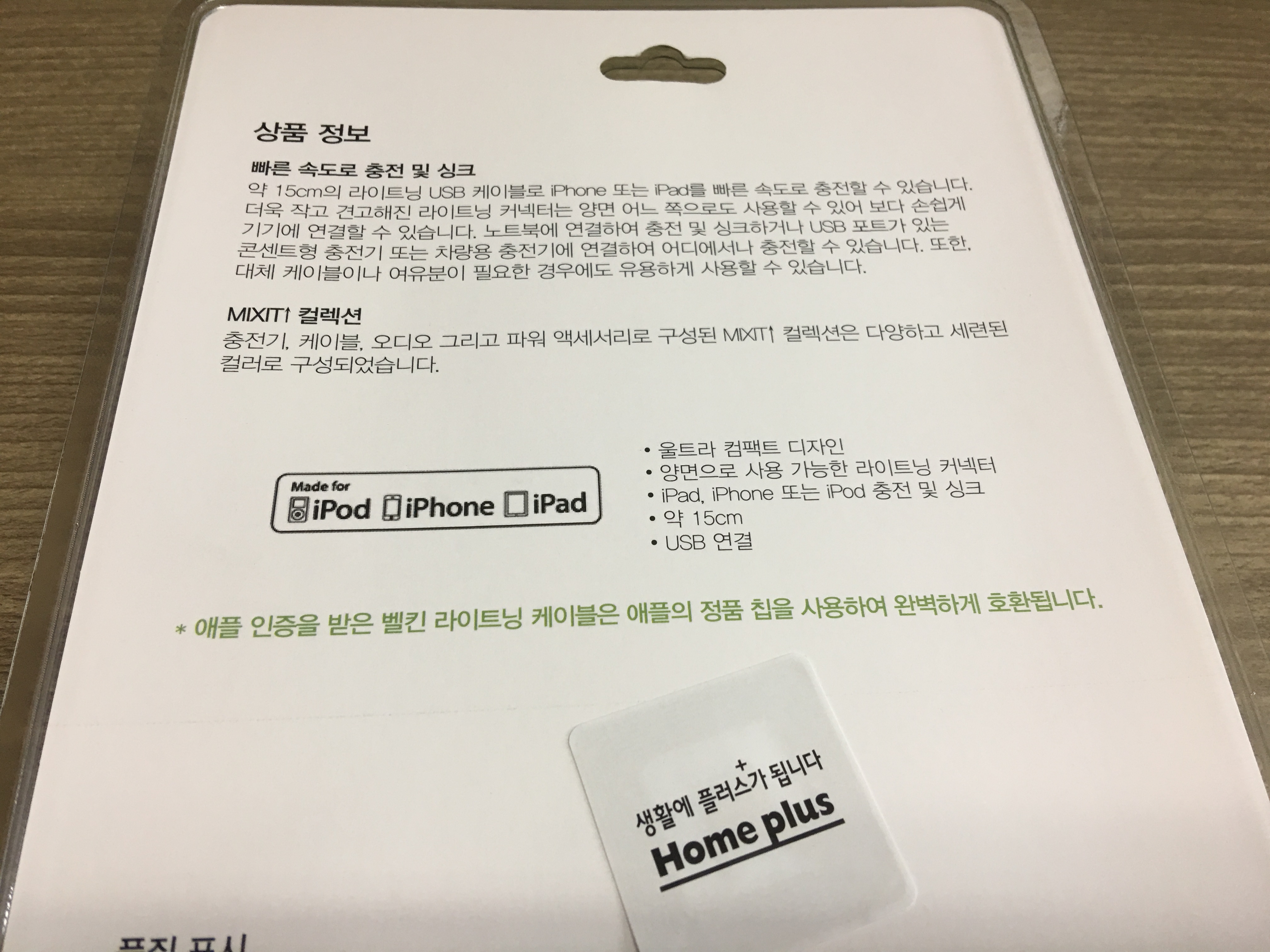 원래 벨킨 15cm 케이블은 만원넘어가는 가격입니다. 그런데 홈플러스에 우연히 들렀다가 발견한 저렴한 가격덕분에 벨킨정품으로 구할수 있었습니다.