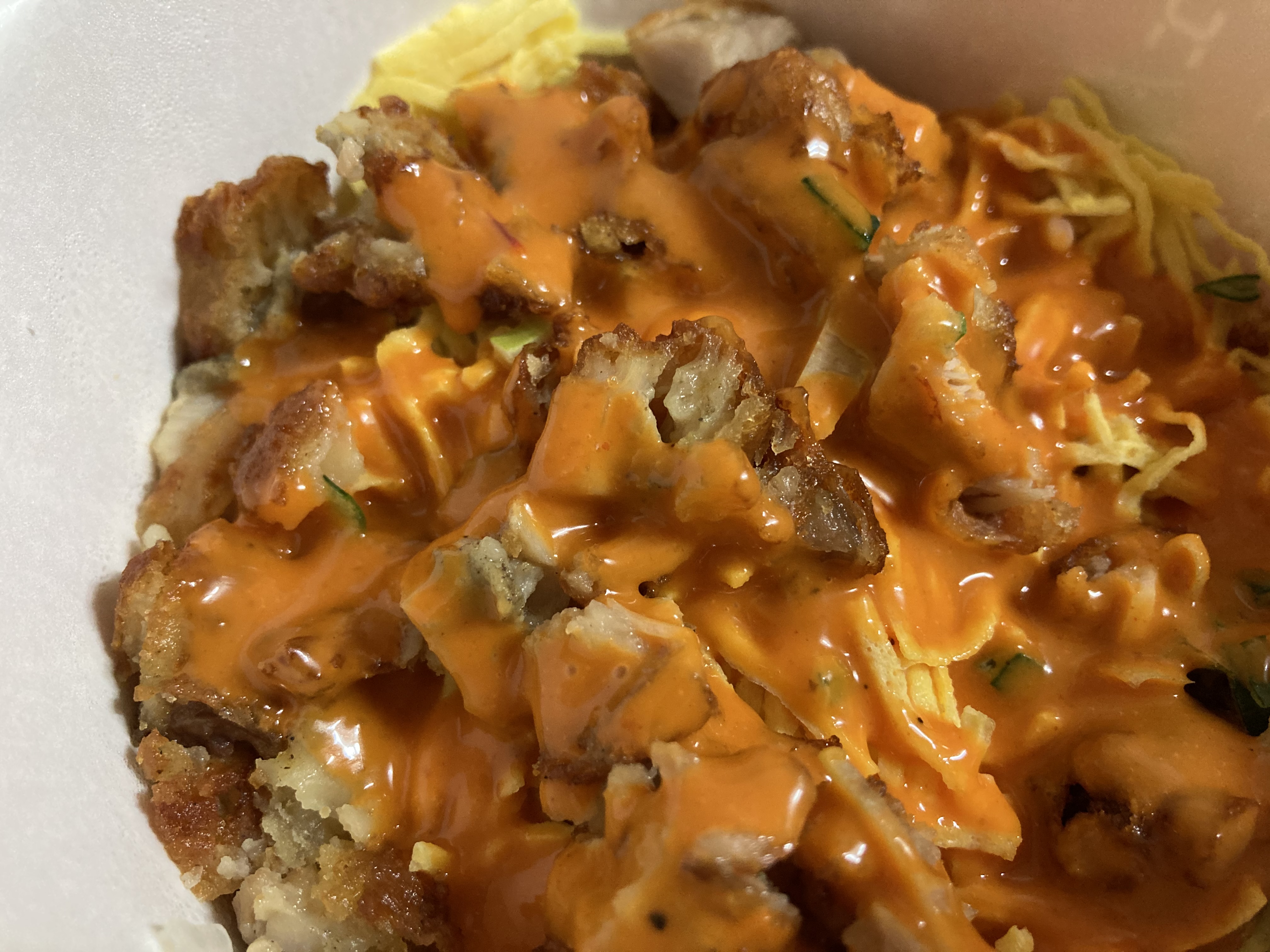 동남아시아 쪽에서 많이 사용하는 스리라차 소스를 이용한 스리라차 치킨마요였습니다.