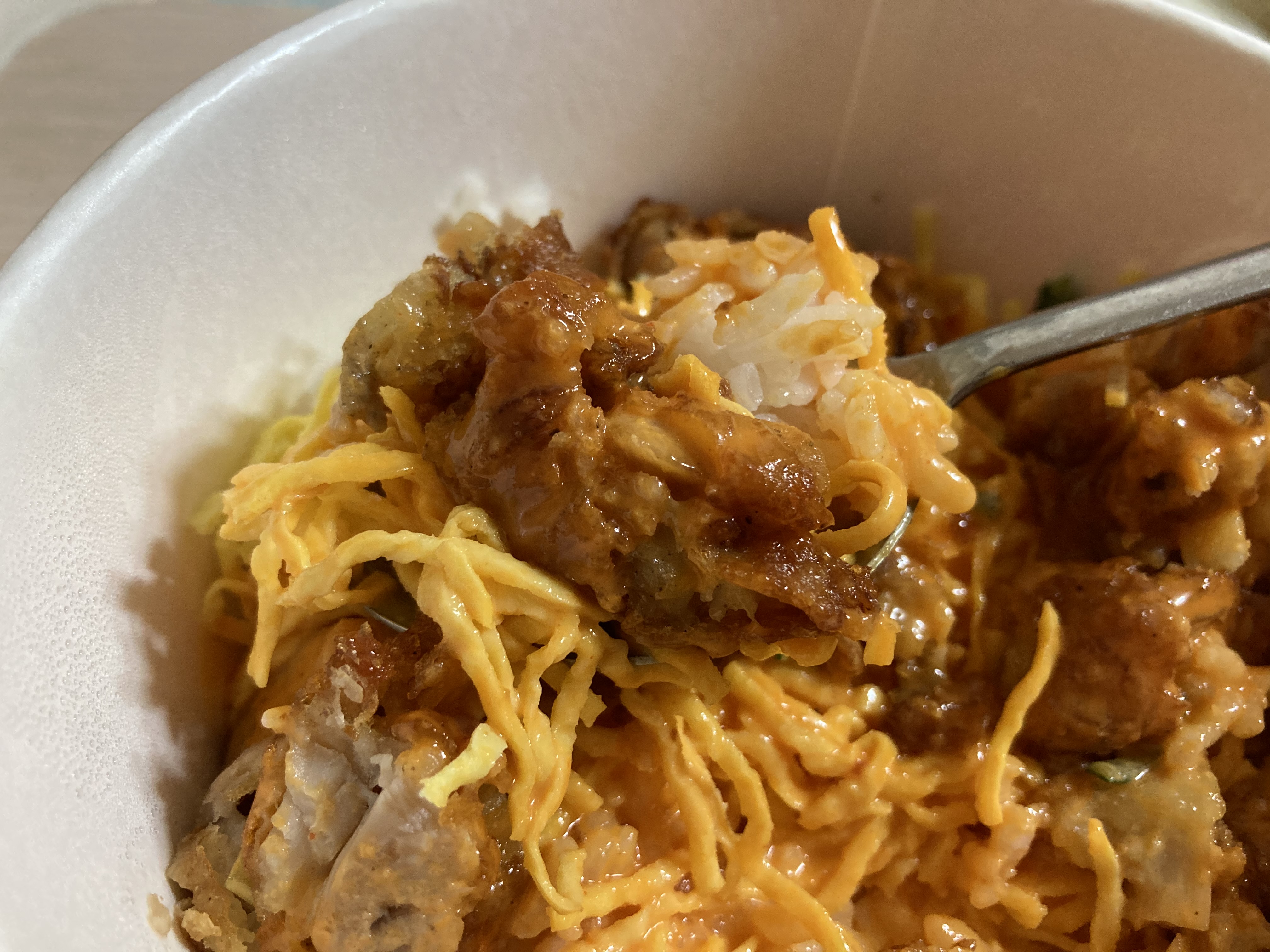 위쪽을 잘 소스와 섞어서 한술 떠보니 확실히 일반적인 치킨마요와는 다르긴 하네요.